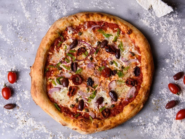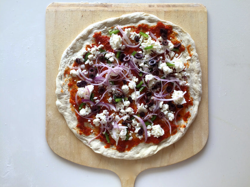 Μόλις παρέλθουν τα 45', ανοίγουμε τη ζύμη με την τεχνική της επιλογής μας στο μέγεθος που θέλουμε και την ακουμπάμε στο MyPizza Peel, αφού πρώτα πασπαλίσουμε με λίγο ψιλό σιμιγδάλι για να μην κολλήσει.