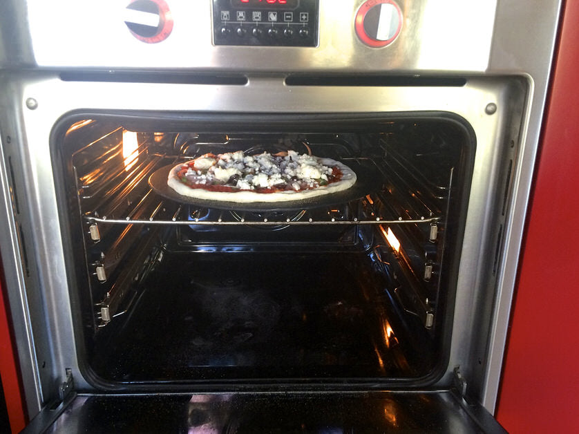 Βγάζουμε την πίτσα από το φούρνο, την τοποθετούμε σε μία σχάρα και ρίχνουμε τη ρίγανη.