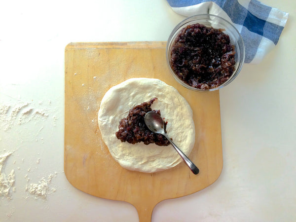 Απλώνουμε τα καραμελωμένα κρεμμύδια αφήνοντας ένα δάκτυλο κενό περιμετρικά.