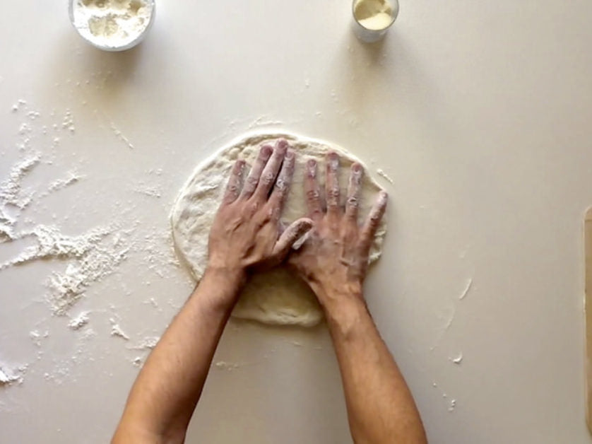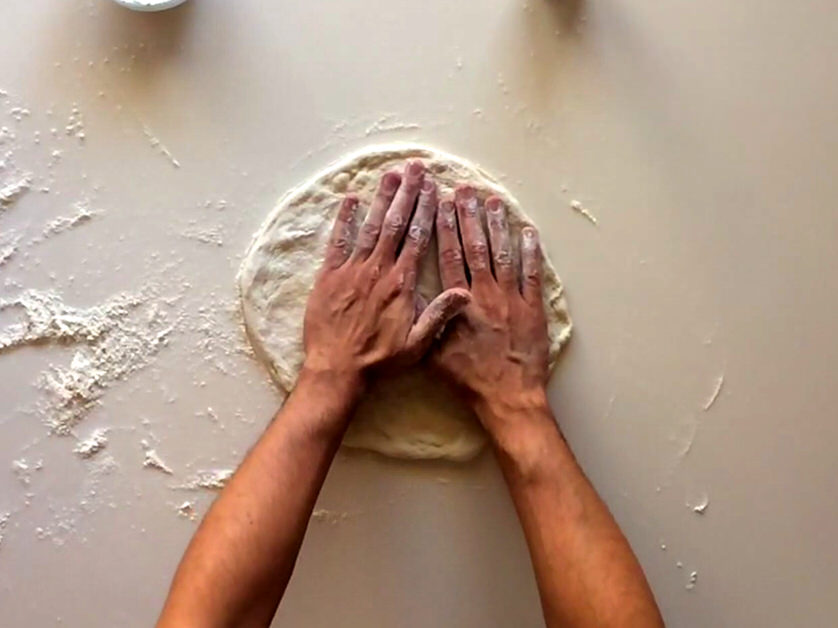 Αλευρώνουμε καλά την επιφάνεια εργασίας και την ήδη ανοιγμένη από άλλες τεχνικές ζύμη. Τοποθετούμε την παλάμη του ενός μας χεριού πάνω από το κέντρο της ζύμης για να το προστατεύσουμε να μην σκιστεί και δίπλα του το άλλο. Με μια απαλή κίνηση ανοίγουμε τα δάκτυλα του τελευταίου πιέζοντας τα ελαφρά προς τα κάτω για να παρασύρουν μαζί τη ζύμη και να την ανοίξουν. Αφού περιστρέψουμε τη ζύμη επαναλαμβάνουμε τη διαδικασία έως ότου αποκτήσει το επιθυμητό πάχος.
