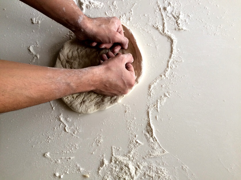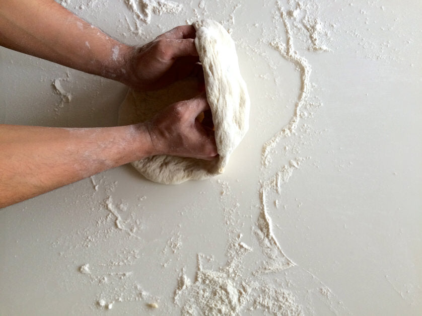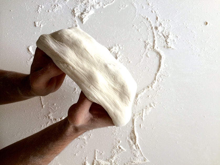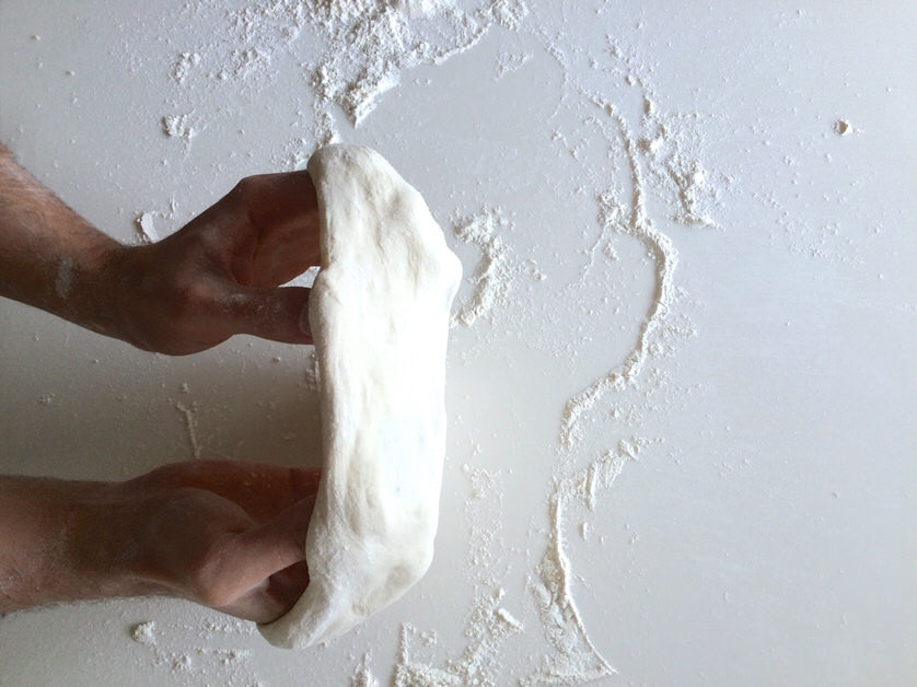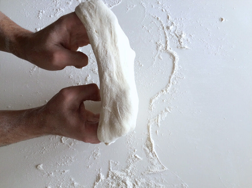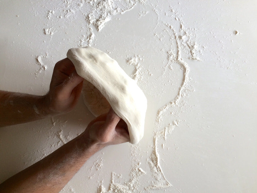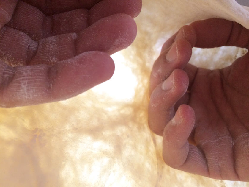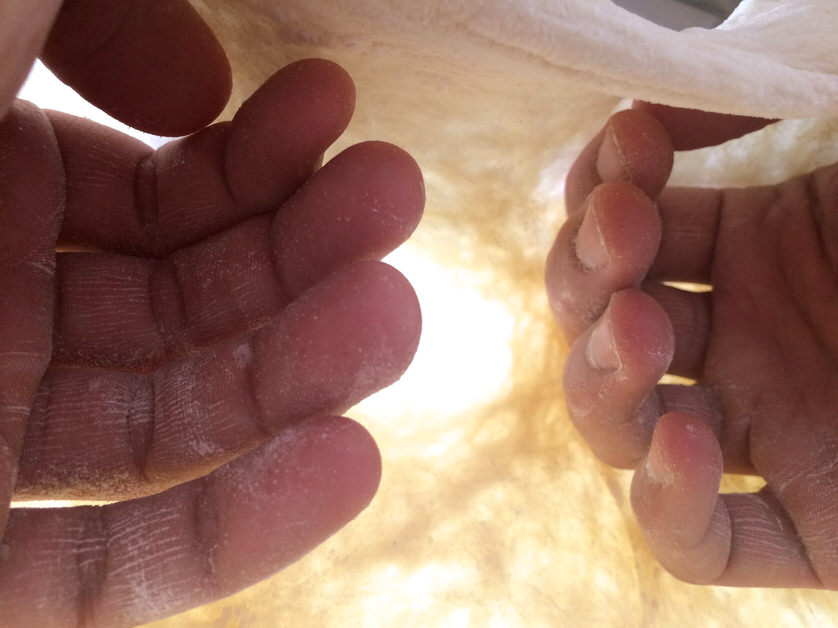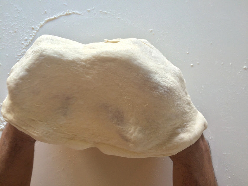 Αφού έχουμε ανοίξει τη ζύμη μας με κάποια από τις άλλες τεχνικές, αλευρώνουμε καλά τη ζύμη και την επιφάνεια εργασίας μας. Για να προετοιμαστούμε για τη σωστή θέση των χεριών, φέρνουμε αντικριστά τις παλάμες μας (να κοιτούν η μία την άλλη) με λυγισμένα δάκτυλα. Ανασηκώνουμε τη ζύμη και περνάμε το ένα χέρι απο κάτω. Κάνουμε το ίδιο και με το άλλο, και τα φέρνουμε στην προαναφερθείσα θέση. Προσεκτικά και φροντίζοντας η ζύμη να μην ανοίξει πολύ λεπτή και σας σκιστεί, ανοίγουμε καλά τα δάκτυλα μας. Όσο επαναλαμβάνουμε την κίνηση αυτή, περιστρέφουμε τη ζύμη πάνω από τις παλάμες μας για να ανοίξει όλη της η επιφάνεια.