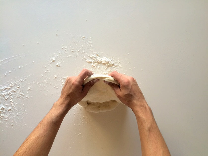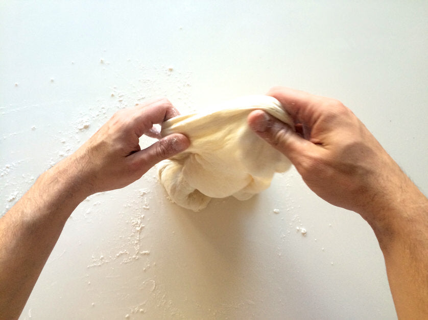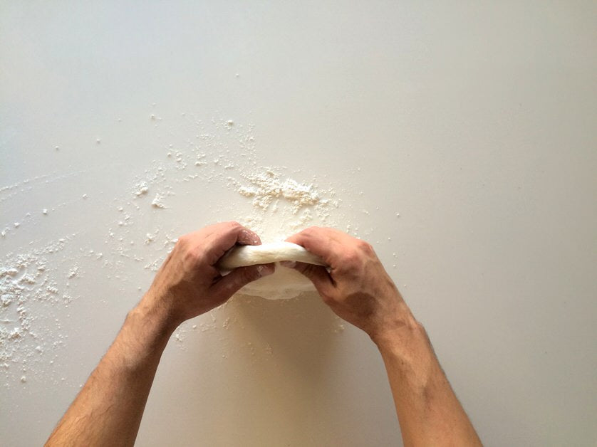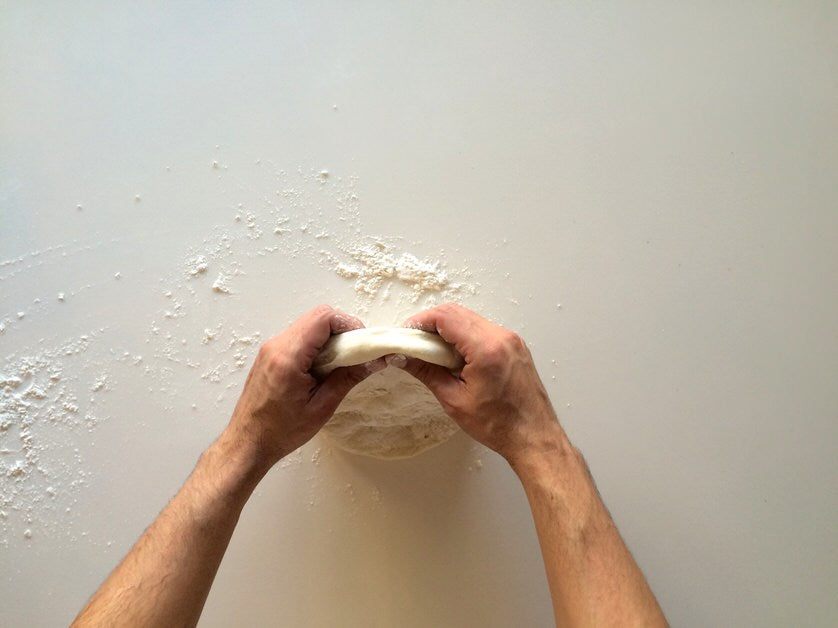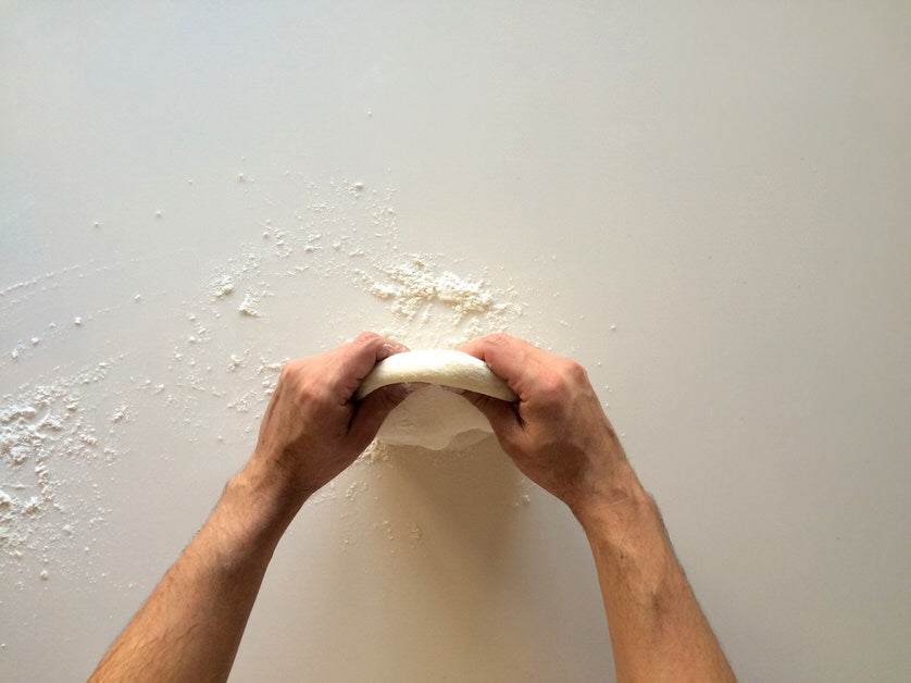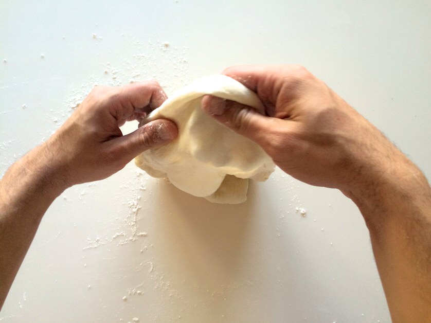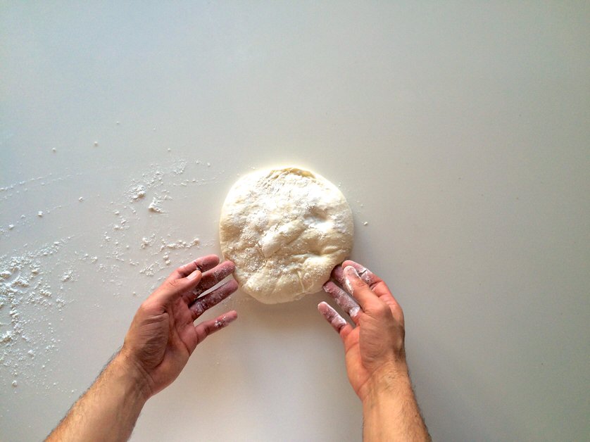 Πριν ξεκινήσουμε είναι βασικό να αλευρώσουμε πολύ καλά την επιφάνεια εργασίας μας καθώς και το ζυμαράκι μας. Στη συνέχεια, πιάνουμε το ζυμάρι στα χέρια μας και πιέζουμε τους αντίχειρες μας ένα δάκτυλο από την περίμετρο, επαναλαμβάνοντας σε όλη την περίμετρο της ζύμης (σαν να κρατάμε ένα τιμόνι).