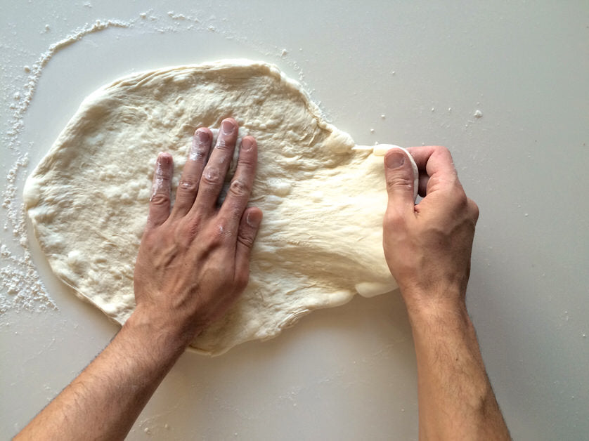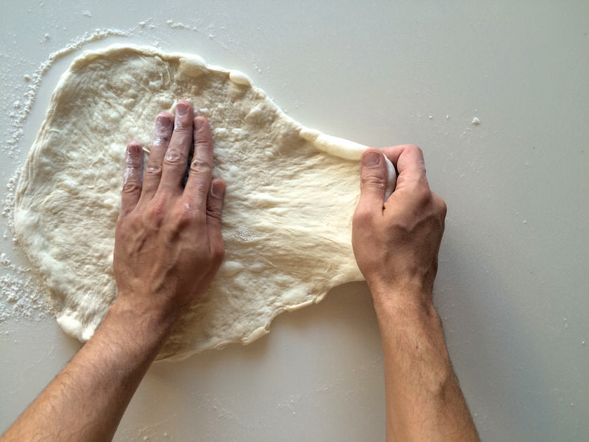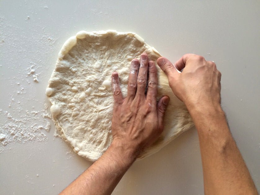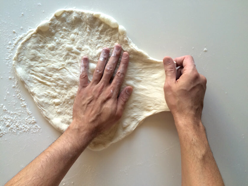 Αφού έχουμε ανοίξει τη ζύμη μας μέχρι το σημείο που μας επέτρεψε η τεχνική του σταδίου Α, αλευρώνουμε καλά την επιφάνεια εργασίας καθώς και τη ζύμη μας. Βάζουμε το ένα μας χέρι πάνω από το κέντρο της ζύμη μας και πιέζουμε ελαφρά την παλάμη μας προς τα κάτω, κρατώντας σταθερή τη θέση της ζύμης. Με το άλλο μας χέρι πιάνουμε την ζύμη που παραμένει ελεύθερη και ανεβοκατεβάζοντας το χέρι μας, χτυπάμε τη ζύμη στον πάγκο, τραβώντας ελαφρά προς τα έξω. Γυρίζουμε κυκλικά τη ζύμηκαι επαναλαμβάνουμε. Αφού ολοκληρώσουμε τη διαδικασία και εφόσον επιθυμόυμε, επαναλαμβάνουμε κατά τόπους για πιο λεπτό αποτέλεσμα.