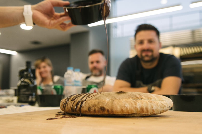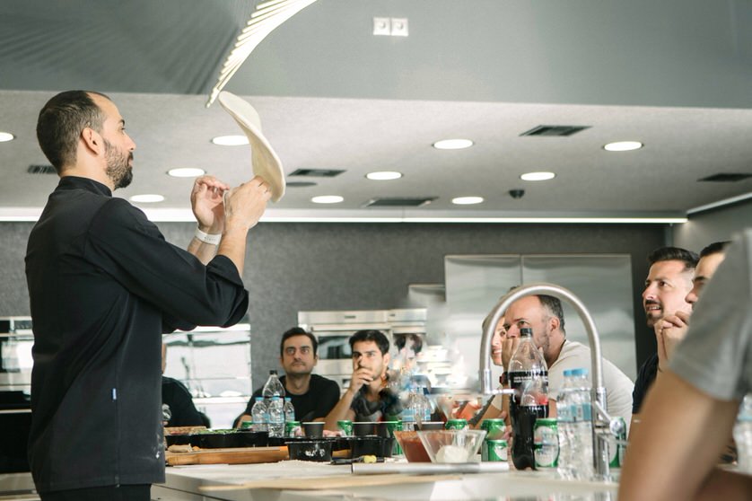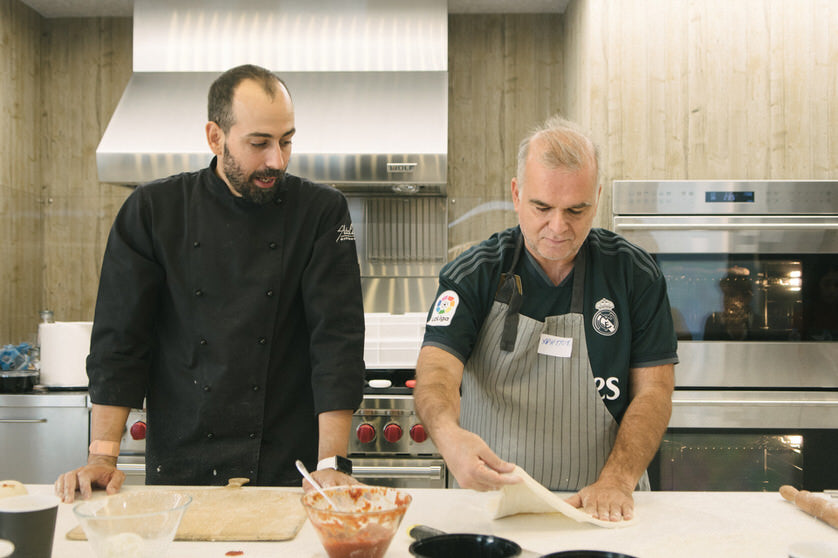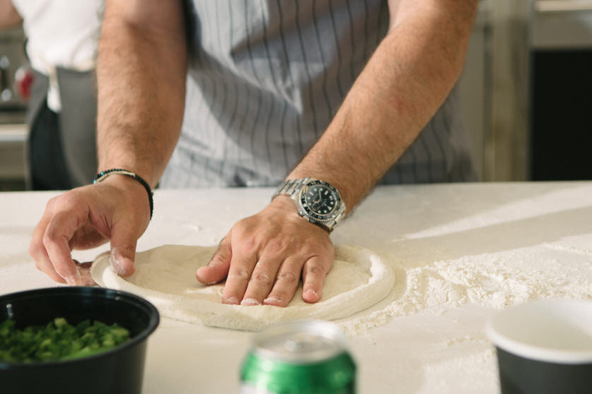 Στη συνέχεια θα σου δείξει διαφορετικές τεχνικές ανοίγματος ζύμης για να διαπιστώσεις ποια ταιριάζει στις δεξιότητές σου και με την καθοδήγησή του θα ανοίξεις μόνος σου το ζυμαράκι σου και θα φτιάξεις μια pizza με τα υλικά της αρεσκείας σου!